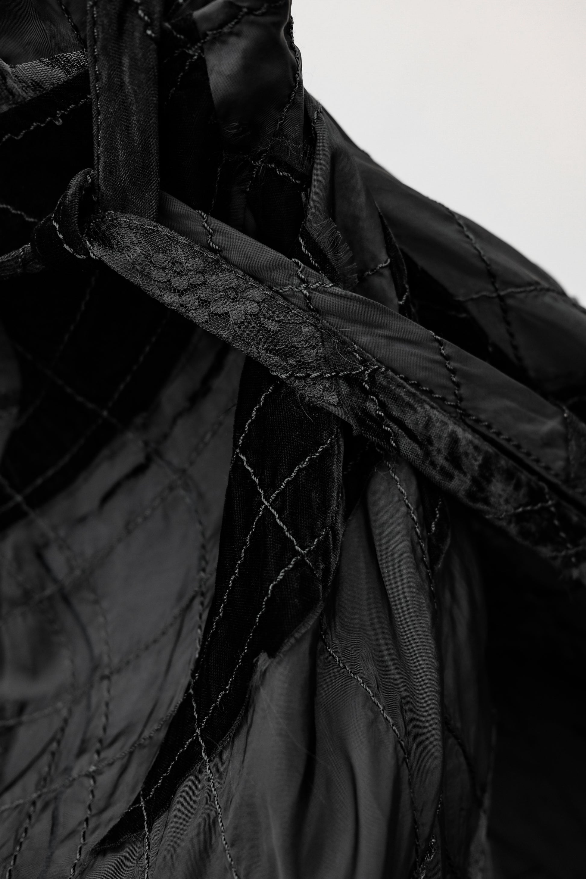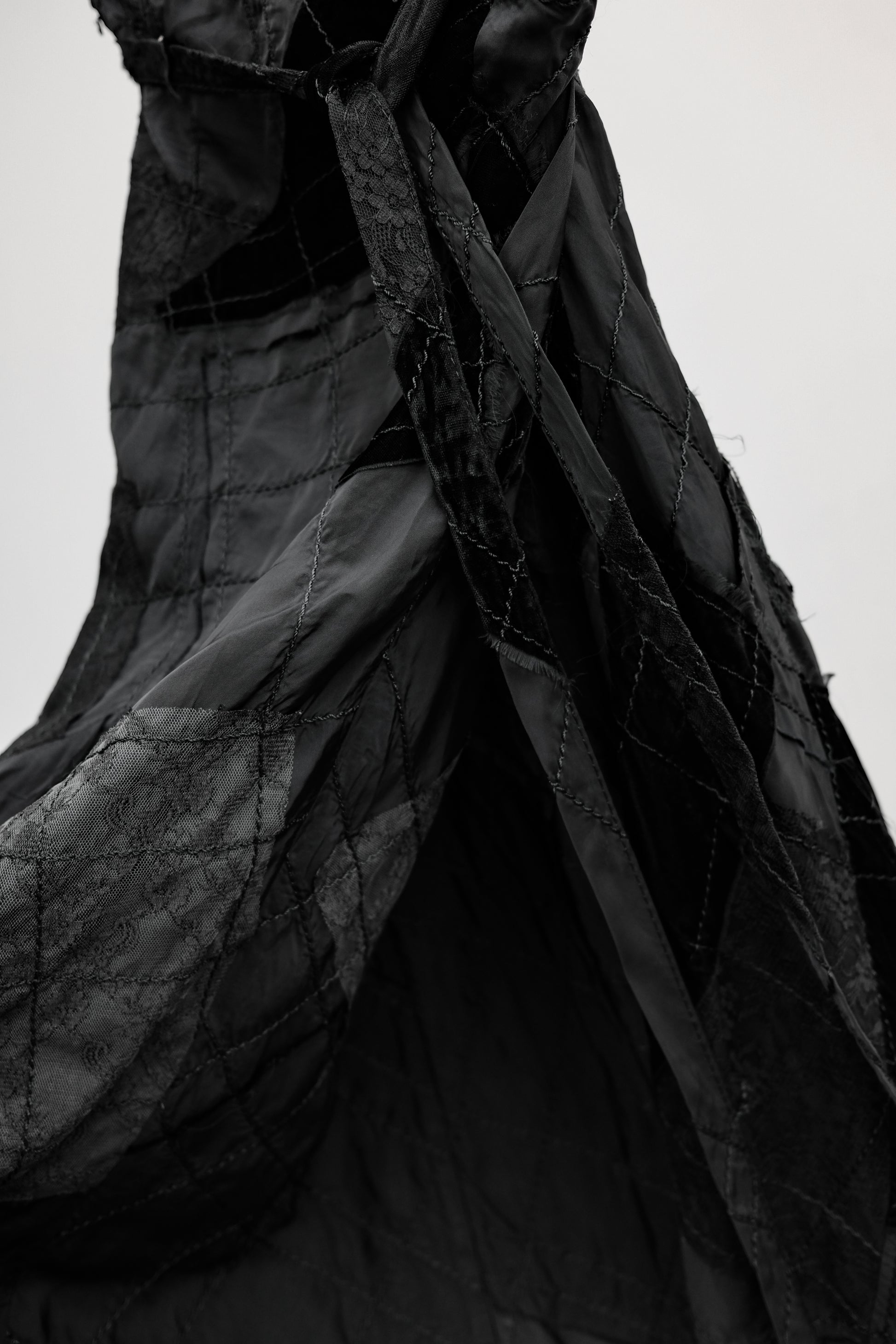 Constructed with multiple fabrics, including jacquard lace, velvet, cupro, and rayon, this piece showcases a rich mix of textures through its beautiful panelled construction.